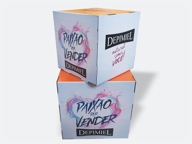 Impresso em alta definição,fácil de montar e feito de papelão, o cubo é uma boa alternativa para dar uma ambientação legal para seu evento ou para promover um produto. É possível montar com eles vários “icones” ou “formatos” , como no lego, para deixar sua divulgação mais criativa. O cubo vem em três tamanhos, 40x40cm, 50x50cm e 60x60cm.