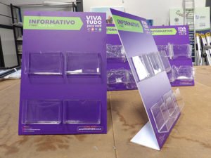 O display de mesa é um material promocional, normalmente pequeno. Serve para ficar exposto em mesas, balcões, suportes em geral. Esse tipo de produto permite que você coloque informações, imagens, divulgação, sinalizações, promoções de produto etc.
