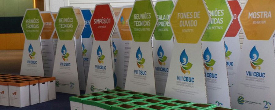 O segredo em eventos desse porte é saber unir a identidade visual aos materiais que podem ser utilizados para auxiliar o andamento do evento, como as placas e os totens. Com a possibilidade de serem feitos em vidro, acrílico, madeira, PVC e alguns outros materiais, os totens e as placas como sinalizadores informativos ou direcionais são essenciais para manter todos os visitantes cientes do que ocorre no evento e aonde ocorre.